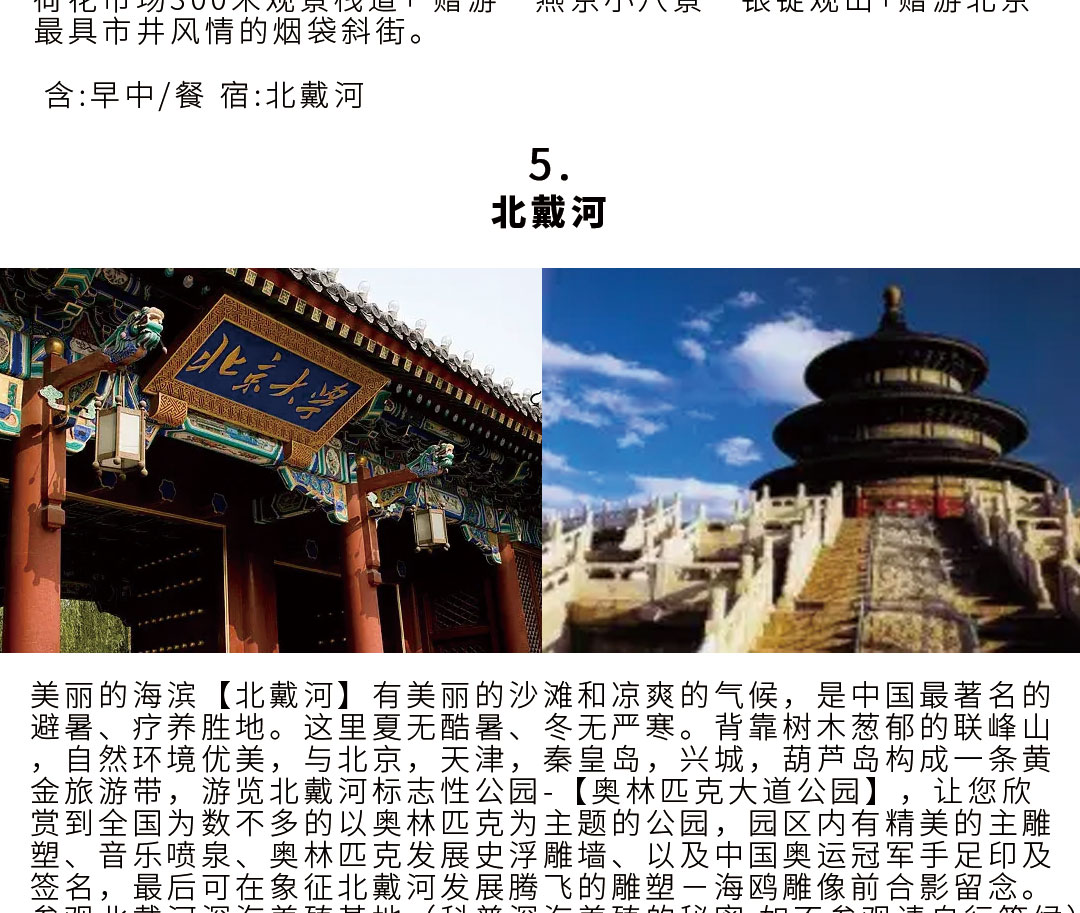 ★精华景点:天安门广场 毛主席纪念堂 故宫博物院深度游5小时-含故宫手工) 八达岭长城畅游3小时 颐和园寻桃花源亲子互动记畅游2.5小时 什刹海风景区 老北京胡同四合院 奥林匹克鸟巢水立方 打卡网红北京坊 走进清华大学艺术博物馆 清华大学主校门打卡 鸽子窝公园浪淘沙北戴河 奥林匹克大道